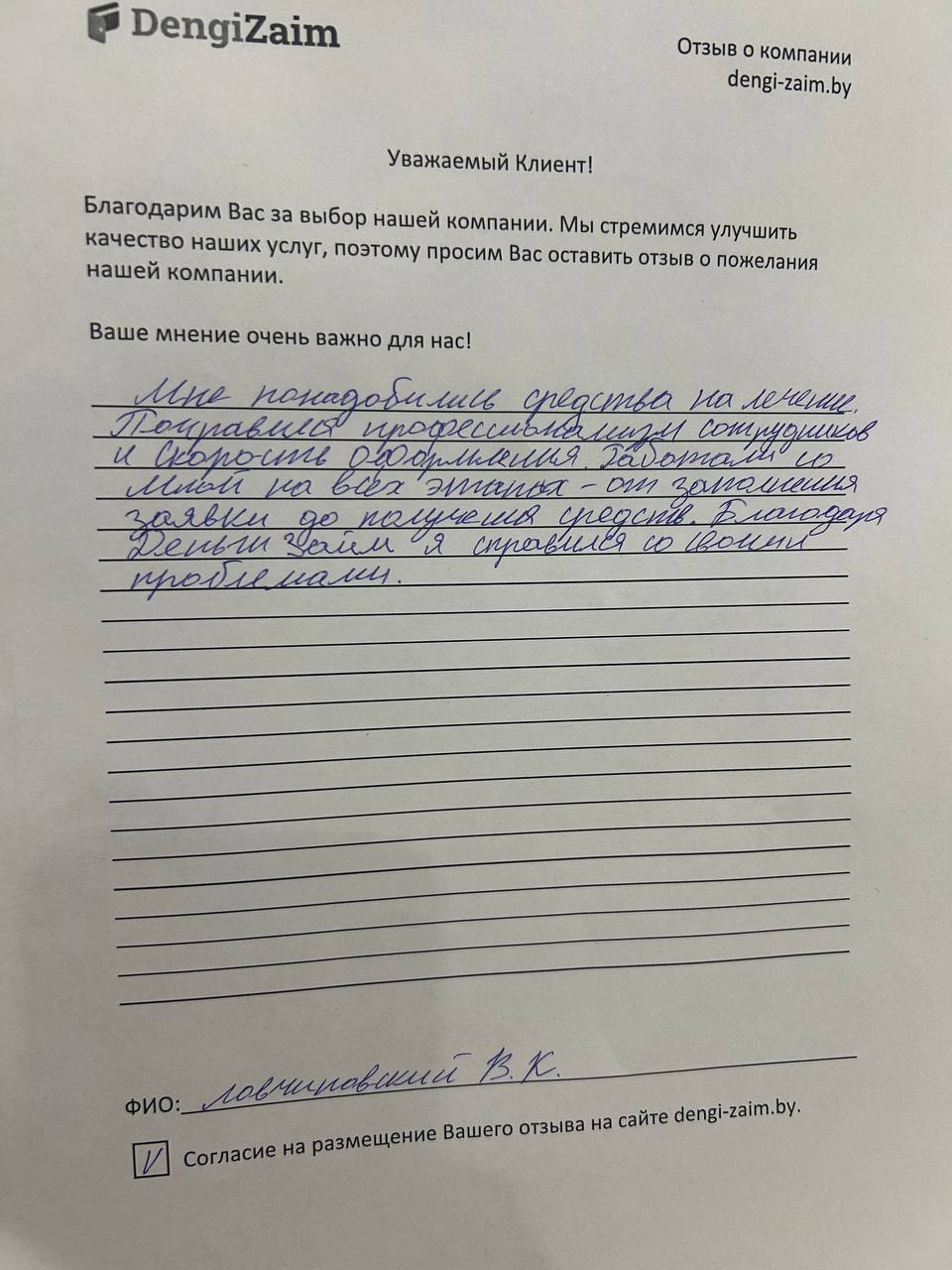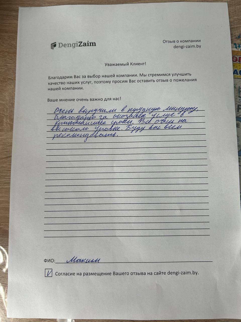Спасибо dengi-zaim.by за оперативное решение моего вопроса. Заявку рассмотрели моментально, деньги перевели быстро. Очень удобно.