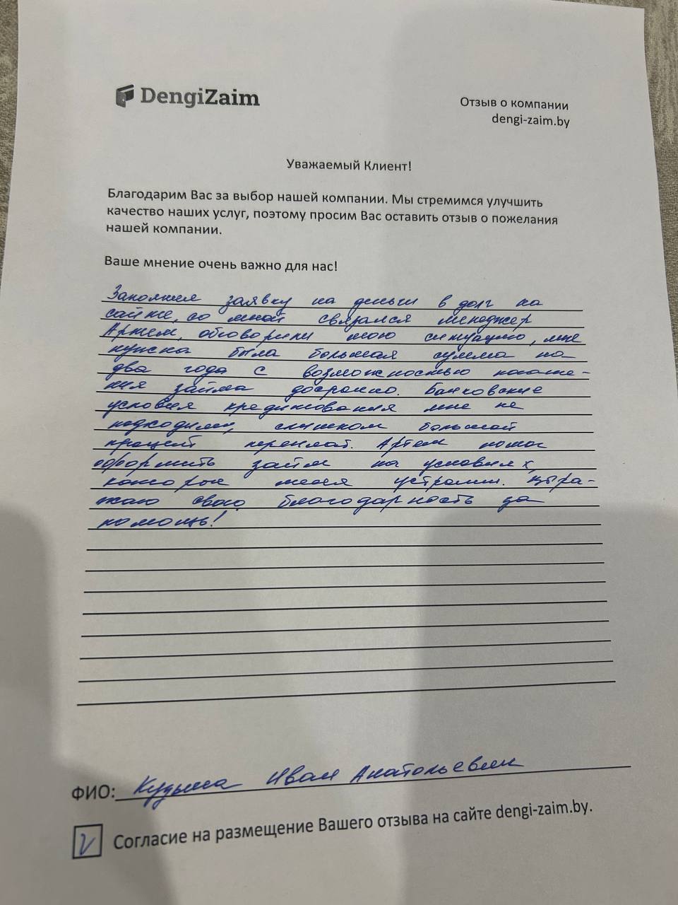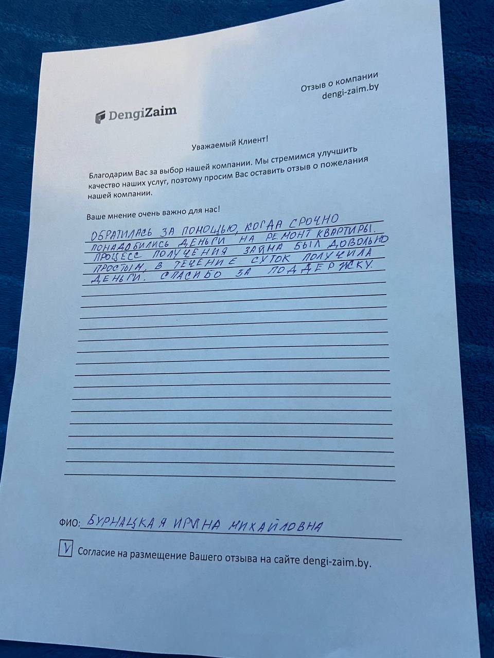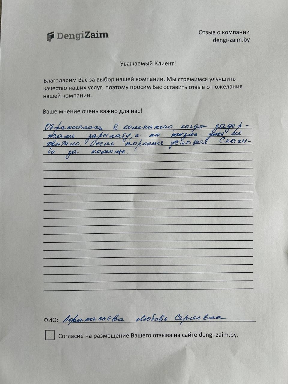 Спасибо dengi-zaim.by за оперативное решение моего вопроса. Заявку рассмотрели моментально, деньги перевели быстро. Очень удобно.