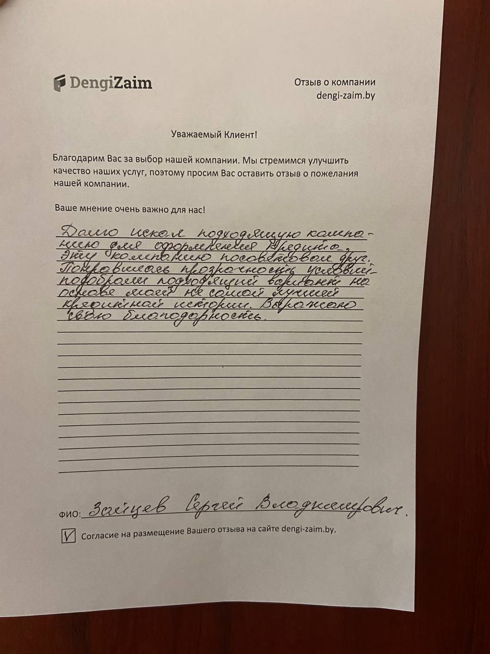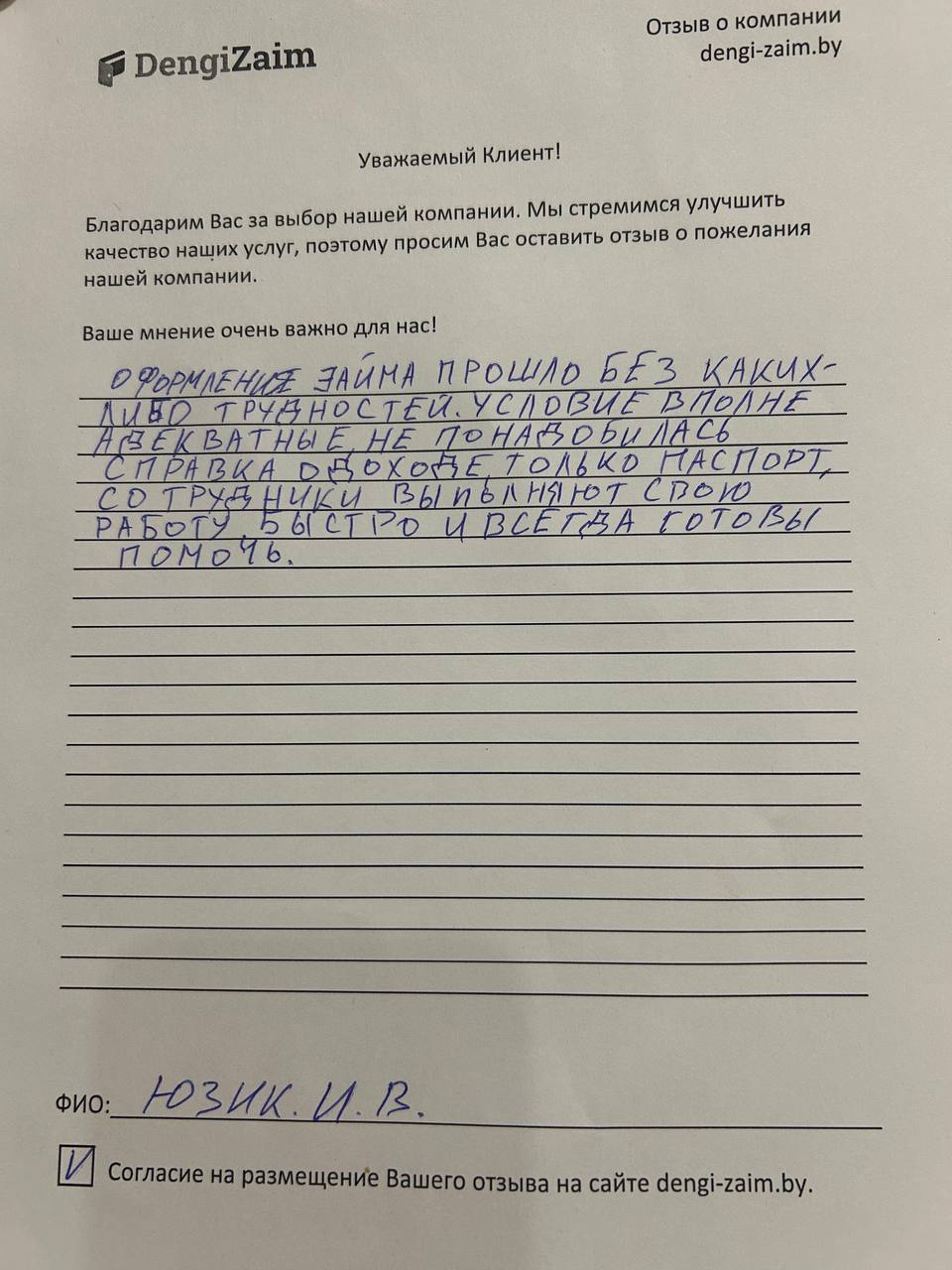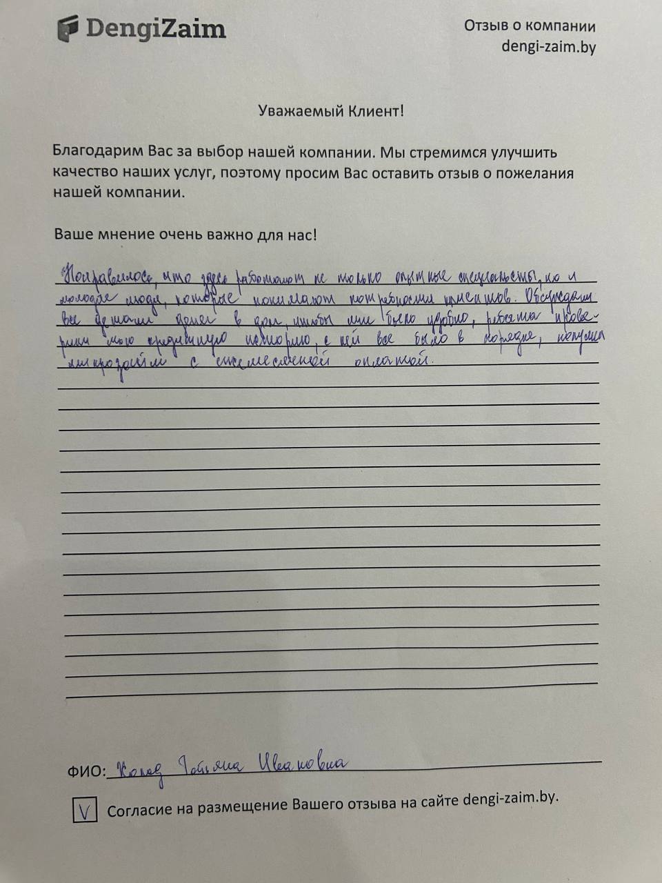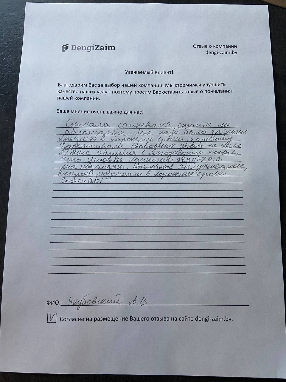 Спасибо dengi-zaim.by за оперативное решение моего вопроса. Заявку рассмотрели моментально, деньги перевели быстро. Очень удобно.