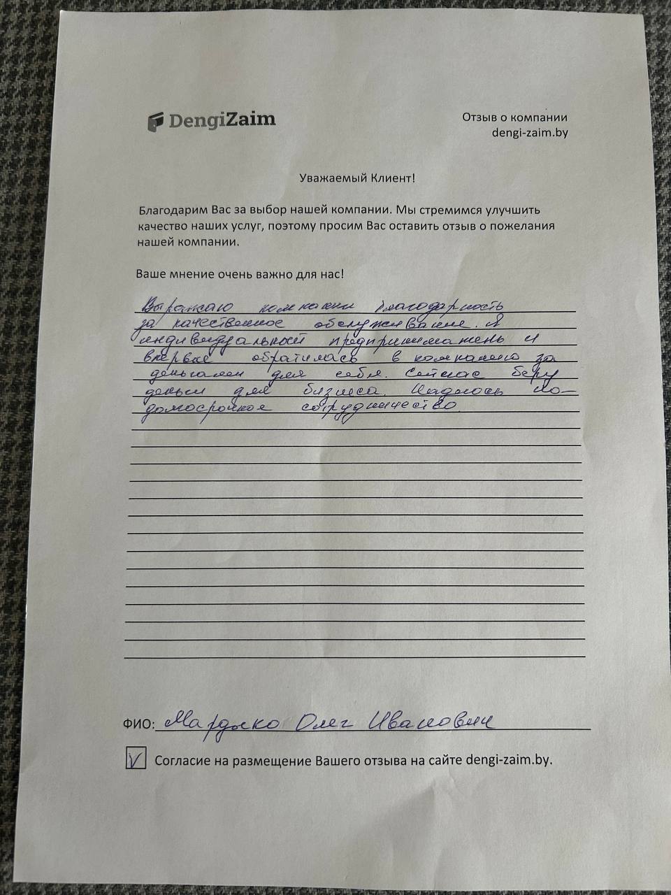 Выражаю компании благодарность за качественное обслуживание. Я индивидуальный предприниматель и впервые обратился за деньгами для себя. Сейчас беру деньги для бизнеса. Надеюсь на долгосрочное сотрудничество.